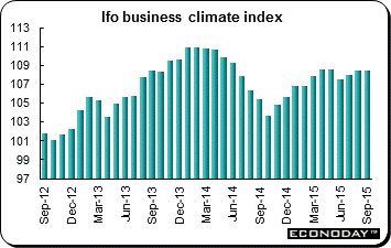 September's Ifo survey pointed to little change in overall business sentiment this month as weaker current conditions were offset by a more bullish assessment of the economic outlook. The headline index edged just 0.2 points higher to 108.5. The measure has been within a tight 106.8 to 108.7 range since the start of the year. However, the relative stability of the overall gauge masked slightly more volatile components. The current conditions sub-index fell 0.8 points to 114.0, its first decline in three months but still slightly above its July posting. Expectations on the other hand rose 1.1 points to 103.3, their highest mark since April although, again, comfortably within the range seen over the year to date. At a sector level morale improved to multi-month highs in retail, construction and wholesale but slipped in manufacturing (lowest since February) and to a lesser extent, in services.