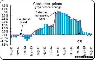 Inflation continues to defy the Bank of Japan. As expected the consumer price index excluding fresh food slipped 0.1 percent on the year and was unchanged on the month. The CPI excluding both fresh food and energy was up 0.3 percent and 0.8 percent on the year. Energy prices continue to weigh on the index, declining 10.5 percent on the year. However, food excluding perishables was up 1.8 percent from a year ago while electronics goods and TV were up 5.4 percent and 8.7 percent respectively. Only last week, Bank of Japan governor Haruhiko Kuroda reiterated that the country remains on track to reach its 2 percent inflation target around the first half of 2016 (it had originally been by April 2015) as the effects of low oil prices fade and the economy continues its moderate recovery. But that target still looks way off, given the most recent data show prices going backward at the core level.