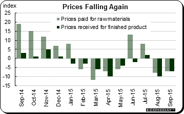 The Philly Fed had also been reporting consistent strength until falling into the negative column this month as seen in the dark columns of the graph. The Empire State report, tracked in the light column, made headlines back in August when, to everyone's complete shock, it suddenly broke into contraction. Prices received in the Philly report, like the Kansas City report, have been in contraction the last two months. Prices received in Empire State are also now in contraction. Contraction in new orders and the working down of backlogs are other consistent patterns in these reports and, unfortunately, point to an extending downward slope for the factory sector.