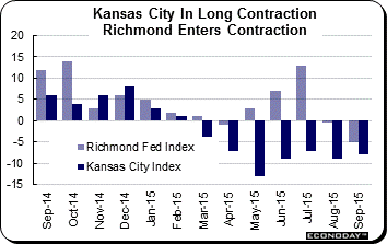 The Kansas City report has been in the serious dumps for the last seven months. The dark columns in this graph track the main index where the sub-zero run reflects the damage from weakened exports (the result of weak foreign demand together with the strength of the dollar) and also the collapse in energy spending. The Richmond Fed's index, the light columns, are also now in contraction. Until September, the Richmond Fed had been posting some of the most consistently solid numbers of any regional report.