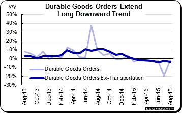 A monthly downswing in aircraft orders pulled down the durable goods report in August and is expected to pull down factory orders as well, by a consensus 1.3 percent. Factory orders have been struggling all year, pulled down by weak exports and moving steadily into year-on-year contraction.