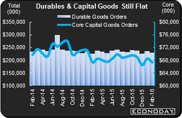 Weakness in the durables report includes a very steep 0.9 percent decline for total shipments which is an unfortunate surprise given the 0.2 percent uptick for the manufacturing component of the industrial production report. Unfilled orders were also very weak, down 0.5 percent in the month and down 1.6 on the year in readings that are not promising at all for manufacturing payrolls which have been dead flat for the last year. Inventories, at minus 0.3 percent, are coming down but not fast enough with the inventory-to-shipments ratio up one notch to 1.65. Unfortunately, the weakness in this report may be more than just a one-month disturbance as it extends, outside of a strong January that more and more looks like an outlier, a long trend of weakness tied to export troubles and major declines for mining and energy equipment. Early signs this month from the Empire State, Philly and Richmond Feds have been very upbeat but have been offset by continued weakness in the Kansas City Fed and the manufacturing PMI reports. It's still too early to say whether the decline in the dollar is giving any relief to the manufacturing sector.