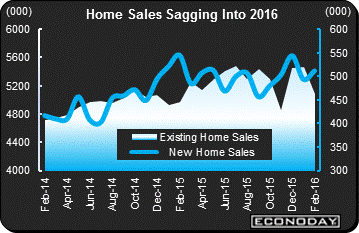 Now the bad news. Existing home sales fell a very steep 7.1 percent in February to a 5.080 million annualized rate for the second lowest showing since February last year. Unfortunately, what makes the report very convincing is that details are uniformly weak. Single-family sales fell 7.2 percent to a 4.510 million rate with condos down 6.6 percent to 570,000. All regions showed declines in the month and no more than low single-digit gains on the year. Prices are soft and are not drawing in new sellers as inventory remains scarce. The weakness in existing homes sales, described as "meaningful" by the usually upbeat National Association of Realtors, substantially offsets February's improvement on the new home side. Housing, if it plans to live up to its 2016 billing, needs a very good showing during its bread-and-butter season, the Spring.