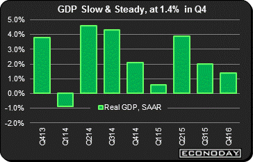 The third and final estimate, at least for now, of real fourth-quarter GDP proved upbeat, at an annualized 1.4 percent. The good news in the report is a further strengthening in personal consumption expenditures, at a plus 2.4 percent annualized rate and a 4 tenths increase from the prior estimate. Core retail sales so far this quarter have been solid but the pace of household spending for the first quarter will become more evident with the Monday release of personal income and consumption data, specifically consumer spending on services. Turning back to the fourth quarter, residential fixed investment gave a 10.1 percent boost to the quarter which, based on new home sales at least, is likely to slow this quarter. Non-residential investment pulled GDP down 2.1 percent and core capital goods readings are pointing to further contraction. Net exports, which may be getting some relief this quarter from the lower dollar, cut 0.14 percent off from the fourth quarter, an improvement from minus 0.25 and minus 0.47 in the prior two estimates.