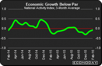 The economy has been improving but not dramatically this cycle, especially since the 2014 collapse in oil prices. The national activity index, which is a broad composite of 85 individual indicators, has been very subdued, holding under the zero line since September last year. Zero here (the red line in the graph) is the economy's historic rate of growth based on this giant batch of indicators. February proved a very weak month for the index as the warm weather drop in utility output pulled down its production component. But mining output also pulled the index down in a reminder that low oil as well as low commodity prices are still pulling the economy lower. The employment component does remain a plus but not personal consumption & housing which remains in the negative column.