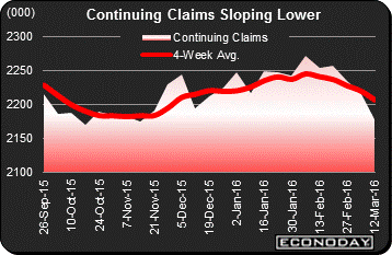 The best news in the week, as it usually is in fact, comes from the unemployment claims report where continuing claims fell 39,000 in the March 12th week to 2.179 million. The March 12th week is also the sample week for the monthly employment report and a February to March sample-week to sample-week comparison shows significant improvement, down 34,000 to 2.207 million. The same comparison with initial claims shows little change and, taken together, they point to another very healthy employment report, this time for March. Initial claims are released one week ahead of continuing claims and a look at the March 19th data shows little change at 265,000 which, for the record book, is the 55th straight reading under 300,000! This is the longest streak since 1973 when the workforce was by comparison much smaller.
