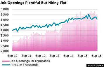 It's simply harder and harder to find the right person. Job openings in the JOLTS report rose a monthly 0.6 percent in September to a total of 5.486 million, yet hiring actually fell, down 3.5 percent to 5.081 million. Year-on-year rates also speak to a mismatch, up 2.4 percent for openings and down 1.0 percent for hires. As seen on the graph, job openings in this series first began to overtake hiring about two years ago in what, as far as monetary hawks are concerned, is a set-up for wage inflation — that employers may soon have to offer more to bring in the people they're looking for. JOLTS (which wins my vote for best indicator name) stands for Job Openings and Labor Turnover Survey.