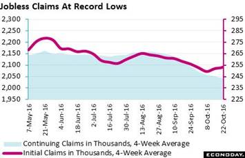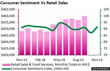 A strong jobs market, together with improving wages, are of course strong positives for the consumer. The prior week's jump in unit vehicle sales offered a strong first indication on October spending while the latest consumer sentiment report is offering a strong indication on November spending, at least very early on in the month. The consumer sentiment index, which was compiled before the November 8th election, rose more than 4 points in the November flash to 91.6 for the best showing since June. The gain is concentrated in the expectations component which rose nearly 6 points to 82.5 to indicate rising confidence in the jobs outlook. Current conditions also rose, up nearly 3 points to 105.9 which specifically points to monthly strength in consumer spending. And rising spirits are confirmed by inflation expectations which are suddenly showing life, up 3 tenths for both the 1-year and 5-year readings and with both at 2.7 percent. But the jury for November is still out and the comparison of the pre-election flash with the final November reading (to be released on November 23) promises to offer an interesting barometer of Trump's victory on the consumer's mood.