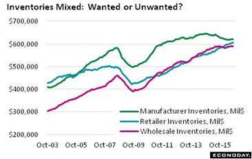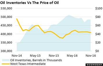 High inventories are also a concern in the energy sector. Oil inventories have built up the last two years and in the latest data for the November 4 week came in at 485 million barrels. This is down from 500 million barrels during the spring but up from September's 470 million level. On-and-off talk of OPEC production cuts can make for short-term gains in prices, such as in October when West Texas Intermediate traded above $50, but prices have held in the $40 to $50 range all year. Energy development was a Republican theme during the election, but high stockpiles and low prices are not a positive mix for new production.
