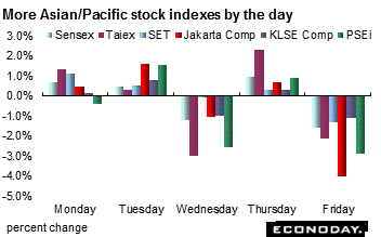 Over the week, most equity indexes advanced with the exception of emerging markets in Asia that can be potentially hit by changes in U.S. international trade and immigration. Gains ranged from 0.1 percent (Kospi) to 5.4 percent (Dow). Declines ranged from 0.5 percent (Hang Seng) to 3.7 percent (Bolsa).