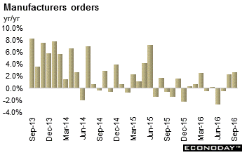 September manufacturing orders declined 0.6 percent following a slightly smaller revised 0.9 percent rise in August on the month. Orders were 2.7 percent higher on the year. The headline monthly decline was concentrated in capital goods which were down 1.6 percent. However, basics were up 0.5 percent as were consumer and durable goods. Regionally the slide was led by the domestic market which unwound almost half of August's 2.4 percent increase with a decline of 1.1 percent. Overseas orders were off only 0.3 percent but this came after a 0.2 percent decrease in the previous month and constituted the third decline in the last four months.