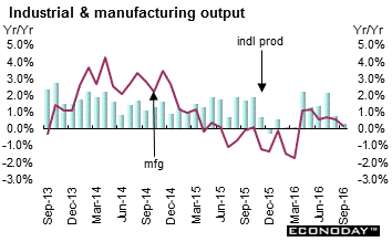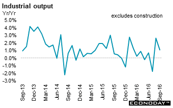 September industrial production was down 1.9 percent on the month but was 1.1 percent higher from a year ago. September's drop was broad-based and led by a 2.4 percent monthly drop in capital goods, albeit after a 5.5 percent jump in August. Consumer goods (minus 1.9 percent) were not far behind but intermediates (minus 0.5 percent) held up rather better. Total manufacturing output was 1.7 percent lower than in the previous month when it spurted 3.7 percent.