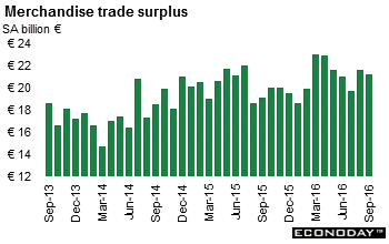 September merchandise trade surplus slipped slightly from a smaller revised €21.6 billion in August to €21.3 billion in September. The unadjusted surplus stood at €24.4 billion, up from €17.4 billion last time. The limited headline deterioration reflected a 0.7 percent monthly decline in exports that more than offset a 0.5 percent drop in imports. This was the fourth decline in the former in five months and while only denting a 3.4 percent jump in August means that overseas purchases have been only flat since March/April. The decline in imports was the second in three months and leaves a similarly broadly stable picture over the last six months or so. Unadjusted annual growth of exports now stands at just 0.9 percent and of imports at minus 1.9 percent.