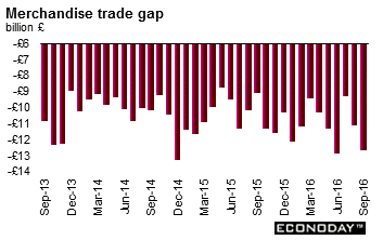 Following a downwardly revised £11.15 billion in August, the September trade deficit widened out to £12.70 billion, its worst reading since June. The deterioration reflected a disappointing combination of weaker exports, which fell 0.8 percent on the month, and higher imports, which were up 3.6 percent. More optimistically, the increase in the headline red ink was only partially mirrored in the core balance which excludes oil and other erratic items. This saw a smaller £0.54 billion rise to £11.77 billion but even this was a record high. Core exports were up 2.8 percent from August while imports were 3.5 percent stronger. Net trade with the other EU members was in a deficit of £8.73 billion, an 11.1 percent rise from last time, while the balance with the rest of the world climbed from £3.29 billion to £3.97 billion. The September data were hit by the boost to import prices caused by the slide in the pound. Underlying volume trends actually seem to be moving in the right direction. Thus, third quarter core export volumes were up 2.2 percent from April to June compared with a 2.4 percent decline in comparable imports.