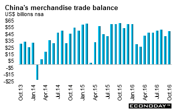 October merchandise trade surplus was $49.1 billion after a surplus of $42.0 billion in September. On the year, exports declined 7.3 percent while imports slipped 1.4 percent. On a seasonally adjusted basis, exports were down 0.6 percent after increasing 3.5 percent in September. External demand from China's key trading partners remained subdued on the year. China's exports to the United States were down after falling 8.1 percent in September. Exports to the European Union fell 8.6 percent after declining 9.8 percent in September while exports to Japan were down 3.2 percent after declining 7.0 percent. In yuan terms, the trade surplus was Y325 billion, up from Y278 billion the month before.