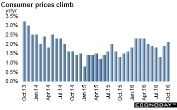 October consumer prices were up 2.1 percent from a year ago after increasing 1.9 percent in September. On the month, the CPI slipped 0.1 percent. The increase in headline inflation was mainly driven by food prices, which were up 3.7 percent on the year after rising 3.2 percent the month before. Non-food prices edged up slightly from 1.6 percent to 1.7 percent in September. Urban areas CPI was up from 2.0 percent to 2.2 percent while in rural areas the CPI was up from 1.6 percent to 1.8 percent.