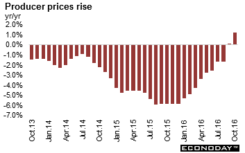 October producer price index rose 1.2 percent on the year after inching up 0.1 percent in September. The PPI has been trending higher since the end of 2015 and has now been above zero for the two last months after almost five years in negative territory. On the month, the PPI was up 0.7 percent, the fourth consecutive monthly increase. Most categories of producer prices posted stronger annual increases compared with September. In particular, prices for production materials increased 1.6 percent, up from 0.1 percent, while fuel & power prices were up 1.8 percent after dropping by 1.9 percent in September. Consumer goods edged up 0.1 percent. Inflation also picked up for metals and other raw materials.