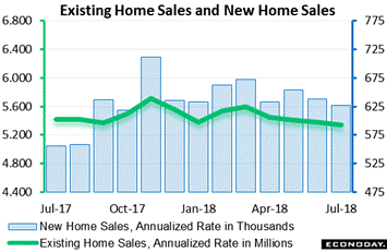 Housing is the one sector of the economy not showing any life. The green line in the graph tracks existing home sales which managed only a 5.340 million annualized rate in July, for a 0.7 percent dip from June and the fourth decline in a row. This is the lowest rate in 2-1/2 years. Resales for both single-family homes and condos are weak, the former down 0.2 percent on the month to a 4.750 million rate and the latter down 4.8 percent to a 590,000 rate. The blue columns track new home sales which in this data set exclude condos and which fell 1.7 percent in July to a 627,000 rate. This is the lowest showing since October last year. Not a positive for housing and what is related closely to the Federal Reserve's rate-hike path is mortgage rates, averaging 4.81 percent in the latest week for 30-year fixed-rate conforming mortgages ($453,100 or less). This rate has been steady this summer but is still up an unfavorable 70 basis points from this time last year.