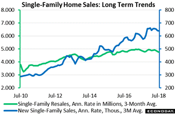 Housing data can be very volatile and it's always a good idea to step back and look at the long-term trends. The accompanying graph tracks sales of existing single-family homes and sales of new single-family homes by 3-month averages but the message is the same, declining sales rates for both. By this measure existing home sales are at a 4.767 million rate, down 3.1 percent so far this year, while new home sales, at a 640,000 rate, are down 2.3 percent. One factor that has specifically held down new home sales is lack of supply on the market as construction has been slow, held down by lack of available construction labor, lack of available lots, and high prices for construction materials.