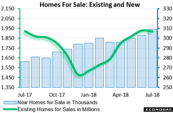 But there are some positives for housing and that's new supply coming into the market for both resales and new homes. Existing homes on the market (green line) have been moving higher this year, coming in at 1.920 million in July and giving home shoppers more choices which should be a plus of sales in the coming months. New homes on the market (blue columns) have been steadily rising, last at 309,000. A risk here, though, is the constraints in the construction sector evident in the prior week's housing starts report where homes under construction were flat and the number of homes permitted but not started were rising.