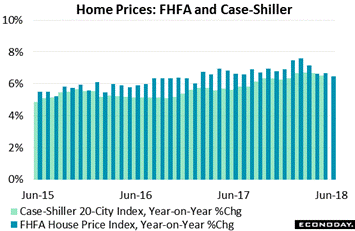 An unwanted feature of the 2018 economy has been moderation in home prices, one tied to the softness in sales. The blue columns of the graph are the FHFA house price index where the year-on-year growth rate slowed by 2 tenths to 6.5 percent. This rate had been approaching 8 percent early in the year. The green area of the graph is the Case-Shiller 20-city index which has also been moving back toward the 6 percent line. Unfavorable mortgage rates are one factor behind the lack of punch in home sales but there are probably other factors as well. One may be a fixed feature of the ongoing recovery, that is a general lack of interest in home ownership evident since the subprime housing meltdown 10 years ago. Case-Shiller data will be a highlight of the coming week's calendar.