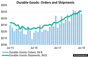But the picture changes dramatically when focusing on the real meat of the durable goods data, and that is capital goods which are goods used to manufacture other goods. The graph tracks the blue line of core capital goods, which are nondefense excluding aircraft, against the green columns of all other durable goods that exclude core capital goods. Here, core capital goods are up $1.0 billion in the month of July to $69.7 billion while all other goods are down $5.4 billion to $177.2 billion. And it's more than just July. Core capital goods have been on a climb this year, up a monthly $3.2 billion from March's level of $66.5 billion while the rest of the durables sector has been sinking, down a monthly $9.1 biillion from a March peak of $186.3 billion. Computers & electronics as well as machinery were positive contributors for the capital goods group in July where strength points to further acceleration for what has already been very strong growth in business investment. And shipments, which of course follow orders, have in fact been very strong, up $0.6 billion in July to $68.6 billion and also up $0.6 billion in June to $68.0 billion. These levels, which are direct inputs to GDP, point to a strong start for third-quarter nonresidential fixed investment and a strong ending for second-quarter fixed investment. What has been behind the rise in capital investment? This year's big corporate tax cut is one answer. Strength in capital goods points to more efficient output and greater economic productivity ahead.