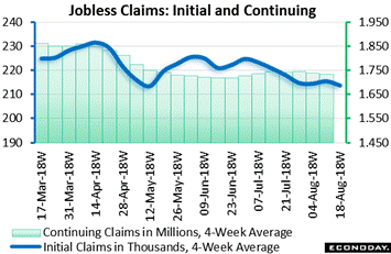 Jerome Powell in Friday's speech at Jackson Hole described the labor market as "strong", which of course is a very favorable assessment and perhaps a bit of an understatement, at least based on layoffs as indicated by jobless claims. Initial jobless claims for the August 18 week, which was also the sample week for the monthly employment report, fell 2,000 to 210,000 with the 4-week average down 1,750 to 213,750. Comparisons with the sample week of the July employment report show a marginal 2,000 rise for the weekly level and a 7,000 decline for the 4-week average in what are favorable signals that point to yet another healthy employment report for August. Continuing claims edged 2,000 lower in lagging data for the August 11 week with this 4-week average down 5,000 to 1.736 million. The unemployment rate for insured workers held at 1.2 percent, which is very low and like all readings in this report is at or near historic lows and consistent with, to say the least perhaps, "strong" demand for labor.