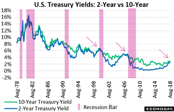 FOMC minutes from the 2-day meeting on July 31 and August 1 were another highlight of the week. They absolutely did not mention President Trump's unprecedented call on July 20 for the Fed to go slow on rate hikes but they did touch on what is a flattening yield curve, specifically a narrowing between the 2-year Treasury yield (blue line) and the 10-year Treasury yield (green line). When these yields have come to together in past, most recently in 2008 and 2001, recessions immediately followed. High short-term rates certainly would not appear to stimulate economic growth but do they in fact predict a recession? "Several" FOMC members according to the minutes raised this concern at the meeting though others were not convinced that this is a statistically meaningful indicator. One who does believe it apparently is St. Louis Fed President James Bullard who was out on the news wires on Friday warning that the Fed should be very careful for these rates not to invert. Yet touching and then inverting, whatever the significance, are real risks given that the 2-year yield follows in lockstep with the federal funds rate. And this latter rate, as underscored by Powell at Jackson Hole, looks to be moving incrementally higher in the months ahead. The latest spread between the two Treasury yields is 20 basis points and narrowing, at 2.61 percent for the 2-year and 2.81 percent for the 10-year. And an added factor is that the 10-year yield, reflecting demand for safety among many investors, is coming back toward the 2-year, falling 5 basis points in the week.