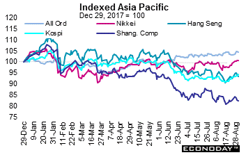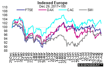 New economic information in Asia was sparse. India released its second quarter GDP which was up 8.2 percent from a year ago and China’s August manufacturing PMI edged up 0.1 point to 51.3. Japan’s industrial production slipped along with consumer confidence while retail sales inched up 0.1 percent. And in the U.S., most data were positive but the international trade in goods deficit widened and pending home sales swooned.