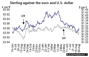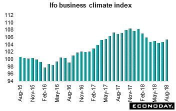 August Ifo business climate indicator reading was 103.8, up more than 2 points from its unrevised July mark and at its highest level since February. Expectations gained 3 points to 101.2, their strongest reading since January, while current conditions were a point firmer at 106.4, a 5-month peak. At a sector level, morale was more optimistic across the board. In particular, manufacturing rose from 22.5 to 24.3 and services from 26.7 to 32.3. However, retail (10.6 after 10.5) was little better than flat and well short of the levels recorded earlier in the year. This is consistent with the recent slide seen in consumer confidence and could warn of a reduced contribution to economic activity from the household sector.