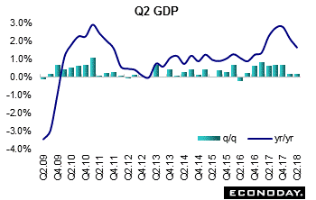 Second quarter gross domestic product expanded at an unrevised 0.2 percent quarterly rate in the final look at the April to June period. This matched the sluggish first quarter reading and so equaled and was the weakest since the last contraction back in the second quarter of 2016. Annual growth was 1.7 percent, also in line with its previous estimate and down 0.5 percentage points from the start of the year. Quarterly growth was held in check by a soft household sector where spending fell 0.1 percent. This reflected a second successive outright decline in purchases of goods (0.3 percent after 0.1 percent) and a marked deceleration in services consumption (0.1 percent after 0.5 percent). However, gross fixed capital formation (0.8 percent after 0.2 percent) picked up well with business investment (1.3 percent after 0.1 percent) especially robust. With government consumption up 0.3 percent, domestic final sales again added 0.2 percentage points to the quarterly change in GDP. Business inventories added 0.2 percentage points but, having had a cumulative minus 0.1 percentage point impact over the previous three quarters, this should not hinder output significantly going forward. By contrast, foreign trade subtracted 0.3 percentage points as exports rose 0.2 percent and imports a much sharper 1.0 percent.