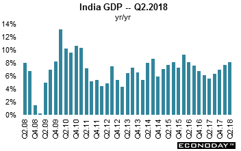 Gross domestic product increased 8.2 percent on the year in the three months to June, picking up from an increase of 7.7 percent in the three months to March. This is the fourth consecutive increase in annual growth and the strongest growth seen since mid-2016. Stronger growth was broad-based, with most major sectors of the economy recording solid growth in gross value added including agriculture, public administration, manufacturing, utilities and construction. However, severe flooding in parts of the country in recent weeks may weigh on economic activity in the near-term.