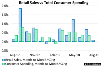 "Modest" is the Federal Reserve's assessment of consumer spending in what sounds off key following a second-quarter when a surge for the consumer made for a very strong 4.2 percent GDP rate. But modest is actually a generous description for August retail sales which managed a hard-to-see 0.1 percent monthly gain as tracked in the blue column at the right of the graph. But retail sales are only about 1/3 of total consumer spending which is dominated by services. Nevertheless, August's results are pointing squarely to slowing for total consumer spending as tracked in the green bars and which will be posted at month end. For third-quarter GDP, August's retail results are an offset to July's solid opening in the quarter.