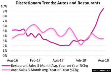 A key weakness in the retail report is a third month of contraction at auto dealers where sales fell a steep 0.8 percent in August in what has been a very poor run for the auto industry. Autos make up about 1/5 of total retail sales and weakness here would be a red flag for discretionary demand if not, however, for the strength in restaurant sales which make up about 1/8 of retail sales. Sales here have simply been on fire. The graph tracks the red line of yearly restaurant sales on a 3-month average along with the 3-month average for vehicle sales. Restaurants and autos are going in opposite directions making conclusions on discretionary demand difficult, yet collapsing the two is reasonable enough and points to yearly growth in the mid-to-high single digits. And that's where total retail sales are, at 6.6 percent in August and showing very little change from July's 6.7 percent.