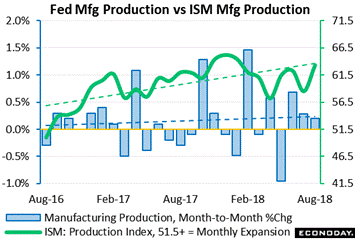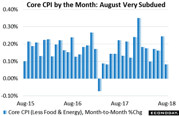 Another interesting verdict of the Beige Book, and one that contrasts perhaps with the perceived need to raise interest rates, is that inflation is rising at no more than a "modest-to-moderate" rate. The report even noted "signs" of deceleration. This is one assessment that definitely proved true in the week's data as the core consumer price index, which excludes both food and energy and which is tracked in the blue bars of the graph, rose only 0.08 percent in August. This is one of the very lowest readings of the ongoing 9-year expansion.