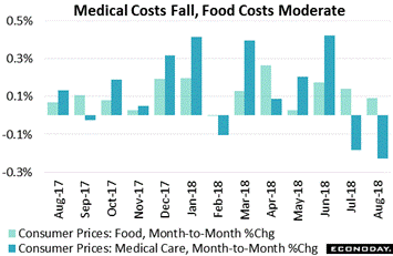 Food isn't part of the core but would be holding down the reading if it were. Food prices couldn't manage even a 1 tenth gain in August, up only 0.09 percent and, at a yearly rate of 1.4 percent, are not pointing to much stress for the consumer. Lack of stress is also the indication from medical costs which, as tracked in the dark columns of the graph, are on a rare 2-month decline, down 0.23 percent in August following July's 0.18 percent dip. This is the first back-to-back decline for this reading in five years and reflects a downturn in physician costs as well as prescription and over-the-counter drugs. Year-on-year medical costs are up only 1.5 percent vs 2.7 percent for total consumer prices.