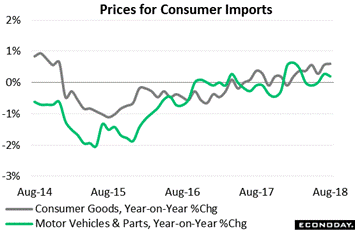 Part of the softness in consumer prices reflects softness in prices of imported goods which fell 0.6 percent in August and were down 0.2 percent when excluding petroleum which is a third straight decline for this reading. Prices of imported consumer goods were unchanged in the month as were prices of imported vehicles. Year-on-year as tracked in the graph, vehicle prices are nearly unchanged, up only 0.2 percent, with consumer product prices up only 0.6 percent. Part of this weakness, and only part, reflects the strength of the dollar which gives U.S. buyers more purchasing power. Much of the weakness reflects a very subdued global price environment evident in export prices which have fallen 0.1 and 0.5 percent the last two months. The risk of imported inflation is not much justification for a month-end rate hike.