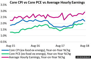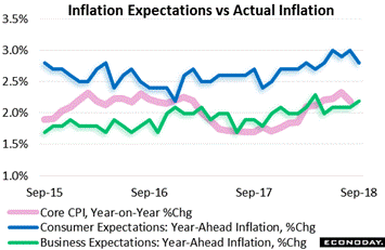 And justification is hard to come by when looking at inflation expectations, an area that Jerome Powell highlighted last month at Jackson Hole when he described stability in expectations as a central precondition for monetary policy. Inflation expectations at the business level, tracked by the green line, are up 1 tenth to 2.2 percent this month which, however, is below a 2.3 percent rate back in April. But inflation expectations among consumers, tracked in the blue line, are not going up at all this month, down 2 tenths to 2.8 percent. Still trends for both, as well as the underlying trend for the core CPI as traced in the pink line, are moving higher -- not much higher, not dangerously higher, but higher.
