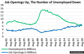 And the week's data offer new evidence on how unusually tight the labor market is. Job openings in the JOLTS report are absolutely surging at the same time that hiring is falling further behind. Openings jumped 1.7 percent in July to 6.939 million with hires unchanged at 5.679 million. Year-on-year, openings are up 11.9 percent with hires up only 3.3 percent with the latter now having fallen for three months in a row. The widening gap between openings and hires strongly suggests that employers are having a hard time finding employees with the right qualifications at the right pay points. Comparing openings to the number of Americans actively looking for work further illustrates the lack of slack and lack of choice for Federal Reserve policy makers. The graph tracks the blue line of openings against the green line of the unemployed. For the first time on record, the number of openings moved past the number of unemployed in March this year. This gap keeps widening and stood at 659,000 in July in a mismatch that raises the risk of coming wage pressures.