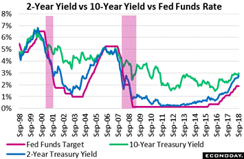 Treasury yields moved noticeably higher in the week. For shorter maturities, this reflects expectations for a rate hike at the coming FOMC while for longer maturities, the rise perhaps reflects rising demand for riskier investments and with it easing demand for safety. The spread between the 2-year and 10-year yields is narrowing fast, now at only 20 basis points in a coming together that preceded the onset of the last two recessions, as traced in the pink bars of the graph. But whether this coming together points to a recession is uncertain. The onset of recession may most reflect the effects of a rising Fed funds target which pulls the 2-year along in lockstep. This target is tracked by the red line of the graph and its immediate and overpowering impact on the blue line of the 2-year Treasury yield is clearly visible. So recession may have less or perhaps nothing to do with the 10-year and may reflect nothing more than the impact that a rising policy rate has on the economy. Based on Fedspeak and the FOMC's own forecasts, the funds rate looks to move 25 basis points higher at month end to 2.125 percent with still another rate hike penciled in to 2.375 percent before the year is out. What direction does this point for the 2-year yield? Upward is a safe answer.
