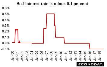 As totally anticipated, the Bank of Japan maintained its interest rate at minus 0.1 percent at its latest monetary policy board meeting. BoJ Governor Haruhiko Kuroda stressed that he won’t pull the plug on monetary easing until inflation hits the BoJ’s 2 percent target, warning that escalating international trade disputes could inflict widespread damage to global growth.