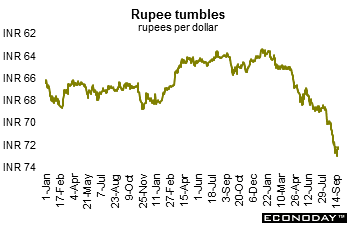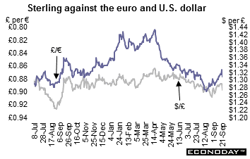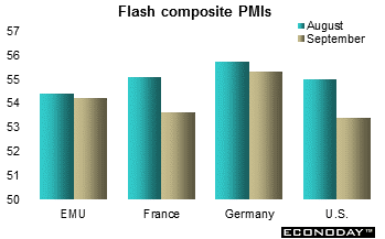 September flash composite output index reading was 54.2, down 0.3 points from its final reading in August and, with the exception of May, its lowest reading since November 2016. Weakness was particularly apparent in manufacturing where the flash PMI dropped 1.3 points from its final August mark to 53.3, a 2-year trough. By contrast, services had a somewhat better month with its flash index rising 0.3 points to 54.7, a 3-month high. News orders followed a similar pattern with a slowdown in manufacturing vying with a solid performance in services to leave aggregate growth at its joint worst rate since October 2016. Significantly, within manufacturing, export orders failed to rise for the first time since February 2015. Overall backlogs saw a modest increase thanks to services as manufacturers recorded their first outright fall in some forty-one months. Employment also continued to expand but another healthy gain in services masked the smallest advance in goods producers in nineteen months. Against this backdrop, private sector business optimism edged a little firmer but still posted its second gloomiest reading in two years (in manufacturing, almost four years). Input cost inflation climbed a little higher as stronger gains in services offset a slowdown in manufacturing. This pattern was reversed in output prices which, in the aggregate, saw another marked increase. Among the core countries, the composite output index fell 1.3 points to 53.6 in France and was 0.3 points lower at 55.3 in Germany. Elsewhere in the region, growth improved just marginally from August's 22-month low and made for the weakest quarter for two years. The U.S. composite reading for comparison was 53.4.