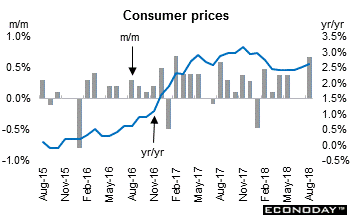August consumer prices were up 0.7 percent on the month and the steepest since April 2011. It was firm enough to lift the annual inflation rate by 0.2 percentage points to 2.7 percent. This was its second successive acceleration and equaled the highest post since January. The main contribution to the monthly change in yearly inflation came from recreation and culture where a 0.6 percent monthly rise was well above the 0.1 percent increase seen in 2017. This alone added 0.06 percentage points. Elsewhere, transport added 0.05 percentage points and clothing and footwear 0.04 percentage points. Partial offsets were provided by communication (minus 0.03 percentage points) and furniture and household goods (also minus 0.03 percentage points). As a result, the core CPI was up 0.8 percent on the month which raised its annual rate from 1.9 percent to 2.1 percent, a 3-month peak.