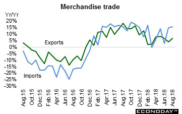 August merchandise trade deficit widened from ¥232 billion in July to ¥445 billion. Exports were up 6.6 percent on the year after increasing only 3.9 percent in July. Imports increased from 14.6 percent to 15.4 percent. The increased exports were largely driven by a strong rebound in demand from the United States, with exports there up 5.3 percent on the year after falling 5.2 percent previously. Exports to the European Union also strengthened, up 7.1 percent on the year after increasing 6.4 percent previously. Regional demand was mixed but slightly weaker on aggregate, with stronger growth in exports to China and Taiwan outweighed by weaker growth in exports to Hong Kong and Korea. After two months of annual declines in both the volume and value of Japan's auto exports, their volume rose 2.4 percent and their values rose 5.3 percent on the year. Stronger headline import growth partly reflected a rebound in the volume of petroleum imports, up 1 percent on the year after falling 10.2 percent previously. Imports of raw materials, machinery and transport equipment also made a larger contribution to headline growth in August, offset by weaker contributions from imports of manufactured goods, chemicals and electrical machinery.