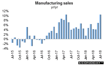 July manufacturing sales were up a monthly 0.9 percent thanks to higher sales in the transportation equipment and chemical industries. Sales were up in 11 of 21 industries, representing 68 percent of total manufacturing sales. Non-durable goods rose 1.4 percent while durable goods increased 0.5 percent. Constant dollar sales increased 1.0 percent, indicating that a higher volume of goods was sold in July. On the year, sales were up 10.5 percent. The transportation equipment industry accounted for more than half of the total increase. Chemical industry sales rebounded 4.6 percent following a 5.4 percent decline in June. Petroleum and coal product industry sales were up 2.4 percent. With the increase in July, sales were at their highest level since October 2014 and reflected higher production in most refineries. In constant dollars, sales were up 1.5 percent in July. These increases were partially offset by declines in the aerospace product and parts, furniture and related products and fabricated metal product industries. Unfilled orders were unchanged in July, following five consecutive monthly gains. New orders decreased for a second consecutive month, down 1.8 percent in July. The decline mostly reflected lower new orders in the aerospace product and parts industry and in the machinery industry.