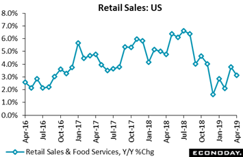 Total retail sales in March were revised higher to a yet larger 1.7 percentage point jump in the year-on-year rate to 3.8 percent which was a positive for the first quarter but not the second quarter. The choppy results from March to April are very likely the result of this year's April shift from early April last year to late April this year, a shift of consequence that jumbles the calendar and seasonal adjustments. There are plenty of warning signs in this report but taking March and April together does offer some comfort, pointing to a more steady and perhaps moderate rate of consumer spending.
