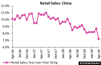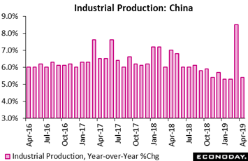 Outside of an unusual spike in March that was tied to a tax change, Chinese industrial production has also been trending lower, at 5.4 percent year-on-year growth in April which was down from 8.5 percent in March and below the consensus forecast for 6.3 percent. On the month, industrial production rose 0.37 percent after increasing 0.97 percent previously. Officials attributed the slowdown to the impact of a cut in value-added tax rates at the start of April. This, they noted, encouraged many firms to build inventories of input materials and boost output in March before returning production to more normal levels in April.