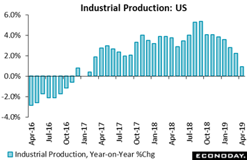 However tight the US labor market may be, capacity does not appear to be tight in the industrial sector as utilization fell 6 tenths in April to a much lower-than-expected 77.9 percent. This report doesn't breakdown production of goods aimed for the domestic market and those for the foreign market but it will nevertheless offer a baseline for the overall effects on goods production of increased US-China tariffs. Going into those tariffs, the manufacturing sector, which first began to slow late last year, appeared to be flat at best.