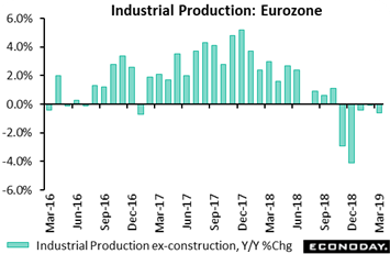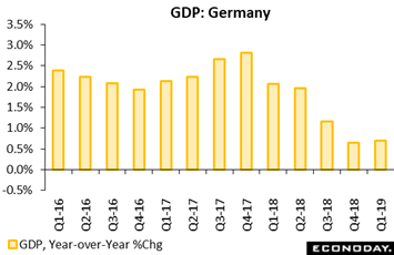 Also less than robust were first-quarter GDP results out of Germany. A provisional 0.4 percent quarterly gain in total output was the first increase since the second quarter of 2018 but only enough to nudge the annual workday adjusted expansion rate, as tracked in the graph, a tick firmer to 0.7 percent. Details were scarce but the report did indicate that private consumption had a decent quarter as did equipment investment and construction. Public sector current spending was soft but there were gains in both exports and imports. Full details of the GDP expenditure components will be released on May 23. For Germany and Europe as well, the ongoing weakness of the manufacturing sector continues to be the major hurdle in the path of respectable economic growth. In recognition of this, the government last month halved its 2019 GDP projection to just 0.5 percent, matching the prior week's updated EU Commission figure. Even a modest 1.5 percent call for next year may be misleadingly firm as it will be boosted by extra shopping days.