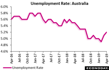 However subdued industrial production has been and however uneven retail sales are beginning to look, employment data in the major economies have been very strong and very steady, which made a rise in Australia's unemployment rate stick out and which gave a jolt to the Australian financial markets at mid-week. Australia's labour market did see an increase of 28,400 in the number of employed persons in April, up slightly from 27,700 in March, but the unemployment rate rose from 5.0 percent in March to 5.2 percent in April and now stands 3 tenths above February's 8-year low at 4.9 percent.